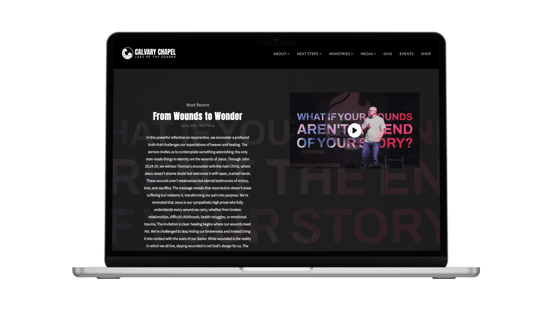 Calvary Chapel Lake of the Ozarks is a church in Kaiser, MO serving the Lake of the Ozarks community. They needed a website that functioned as more than a digital bulletin. The goal was to build something that worked as a genuine front door for first-time visitors while giving the regular congregation easy access to messages, events, and resources.